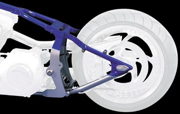 | UHS swingarm conversion kits will enable you to mount a 240 or 250 tire on your stock softail without doing any modifications to your frame! The kits are absolutely complete and you will not have to make anything. Kit for 2000-up Twin Cam softails includes: swingarm, engine sprocket, primary spacer, transmission support, rear axle, super flush axle cover, stainless steel belt guard, stainless steel splash guard, transmission main shaft, 5. gear 25mm offset, starter shaft, clutch operation, necessary spacers, nuts, bolts and washers (check left picture below). Kit for up to 1999 Evolution softails includes: swingarm, engine sprocket, primary spacer, transmission support, rear axle, super flush axle cover, necessary spacers, nuts, bolts and washers (check right picture below). Swingarms are twice powder coated in brilliant black to perfectly mach your stock frame. They can fit up to 9.00" wide rims.