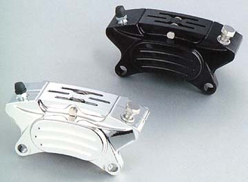 | OMP 4-piston custom brake calipers are for front and rear installation and are available in two different styles: nail or grooved. They feature four Ø 30mm brake pistons. Front brackets are available for installation in conjunction of 13 or 11-1/2 brake rotors. Rear brackets are available for installation on FXST (for single or dual rear caliper), FXD, FXDWG, FXR and XL models.